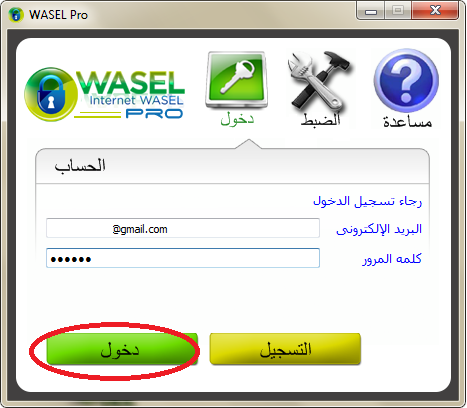 أدخل بيانات حسابك الخاص بواصل برو (البريد الإلكتروني وكلمة السر) واضغط دخول